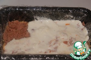 Отцедить консервированный тунец от масла и слегка размять. Поместить сверху морковного слоя, нанести 2 ст. л. крема-соуса.