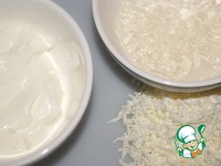 Яйца, морковь и картофель (в мундире) отварить накануне. На мелкой терке натереть фета и белки. Желатин замочить в 80 мл холодной воды. Йогурт поместить в свободную емкость. |
