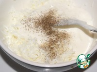 Достать крем-соус из холодильника. Хорошо перемешать. Добавить 1,5 ст. л. в тертые белки, перемешать и выстелить равномерным слоем в форму. |
