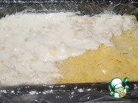 Натертый на крупной терке картофель, посолить и поместить на рыбный слой. Смазать крем-соусом. Учтите, что картофельных слоев будет 2. Первый должен быть тонким. |