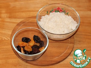 2. Рис отвариваем до полуготовности. Курагу и чернослив заливаем горячей водой, даем время фруктам пропарится.