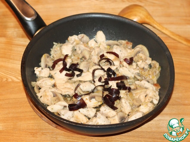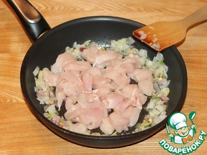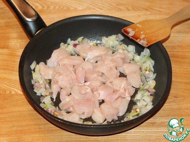 4. Филе курицы нарезать брусочками, смешать с приправой, прессованным чесноком и добавить к луку, обжарить до бела.