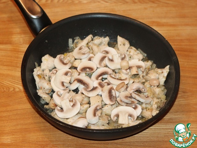 5. Грибы нарезать небольшими пластинами и добавить в сковороду, продолжаем обжаривать.