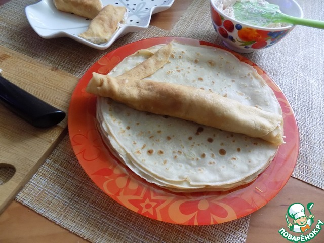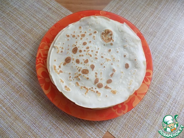 Блины выпеченные укладываем в стопку "изнанкой вверх". Я буду их промазывать колбасно-творожной начинкой. Из этого количества теста у меня получилось 8 шт тонких блинов D-24 см.