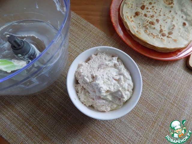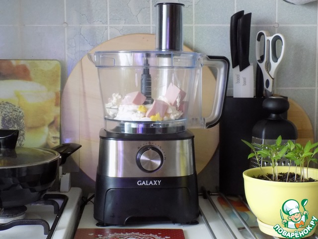 Начинку я сделаю тоже при помощи комбайна GALAXY GL2300 буквально за 20 секунд. Колбасу, сыр творожный, сметану и горчицу выложила в чашу блендера и соединила. Если эти блины будут есть дети, то горчицу класть не нужно.