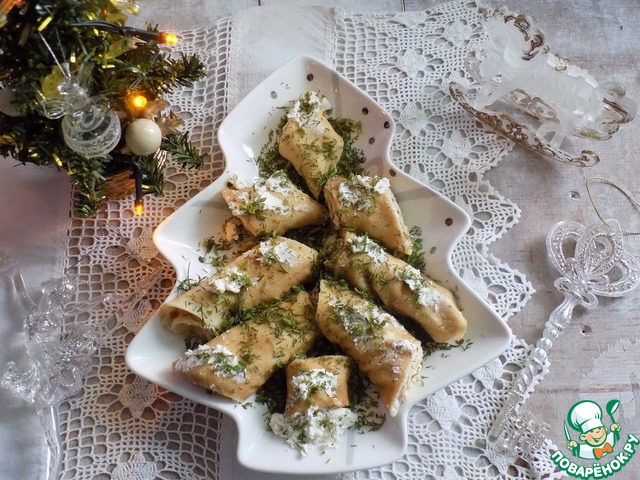 Оформила праздничную подачу ёлочки. Сверху блины обмазала хаотично творожным сыром (как-будто снег). Это для того, чтобы укроп мелко порубленный (ёлочные иголки) зафиксировался на блинах. Вот такая красивая получилась подача и конечно-закуска!