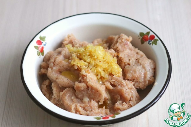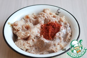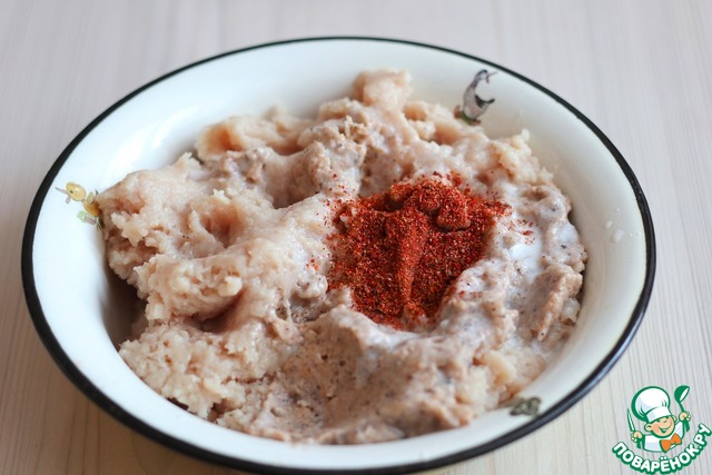 • Соединить в миске фарш и хлебную массу, добавить смесь пряностей по вкусу, добавить соль и черный молотый перец.