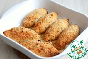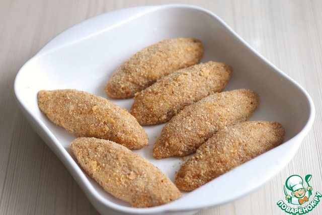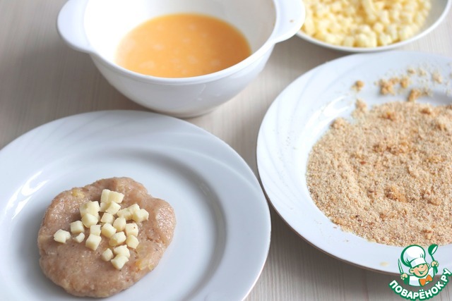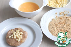 • Яйца (2 шт.) добавить в миску, затем добавить 2-3 ст. ложки молока, смесь взбить. Из фарша сформовать круглые лепешки, на середину добавить нарезанный сыр "Моцарелла", края защипнуть. Сформовать колбаски. Колбаски смочить льезоном, далее присыпать панировочными сухарями.