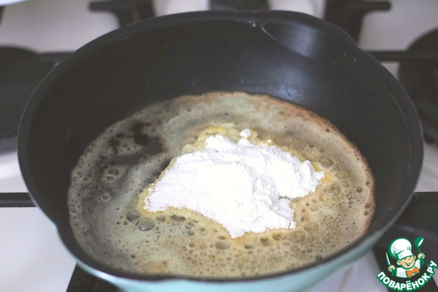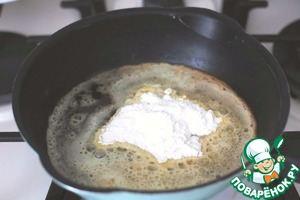 • На сковороду добавить 2 ст. ложки сливочного масла, добавить муку (1 ст. ложка), муку слегка прижарить.