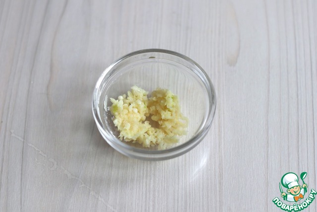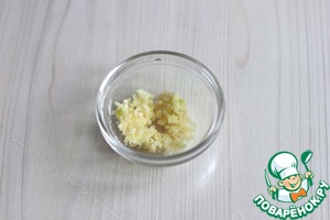 • Чеснок (5 зуб.) пропустить через чесночный пресс. Добавить в соус чесночную кашицу. Соус прогреть на сковороде еще несколько минут и снять с огня. Соус процедить.
