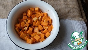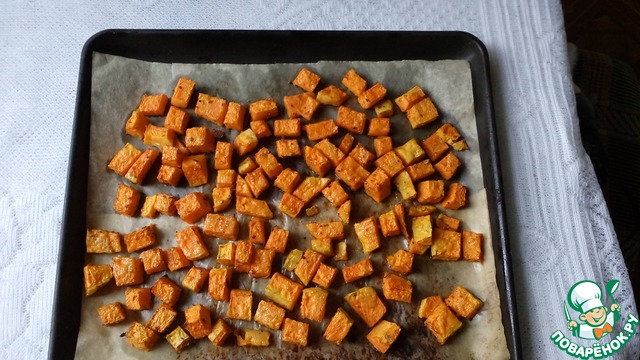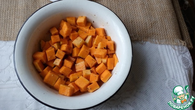 • Тыкву нарезаем небольшими кусочками, добавляем кориандр, корицу, чабрец, свежемолотый перец и оливковое масло. Перемешиваем.