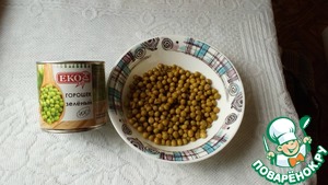 • Зеленый горошек (200 г) с 6 ст. л. жидкости перебиваем блендером до состояния пюре. В банке, изображенной на фото, оказалось как раз 200 г.