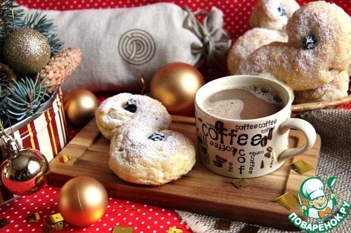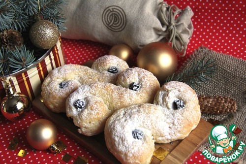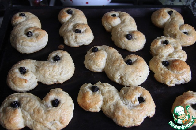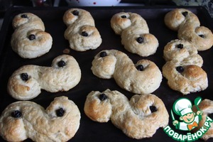 Разделить на небольшие шарики, затем придать тесту форму в виде буквы "S", дать им подойти после формовки в теплом месте. Вложить в центр завитков изюминку, смазать яйцом и выпекать при температуре 180 градусов около 10 - 15 минут.