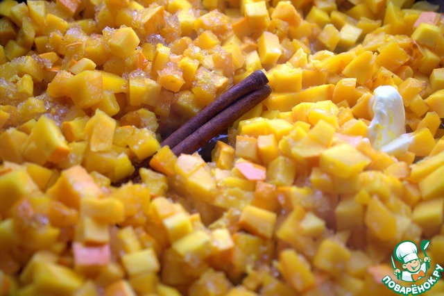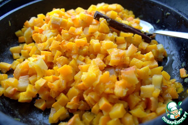 Начинаем тушить тыкву в масле, затем добавим сахар.
