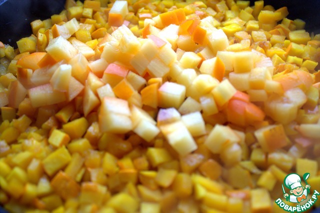 Отправим в сковороду в конце, когда тыква уже размягчилась.