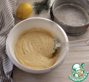 Просеять муку с разрыхлителем и соединить с жидкой массой, размешать до однородности теста. Форму диаметром 22 см смазать маслом, обсыпать мукой, лишнюю стряхнуть.