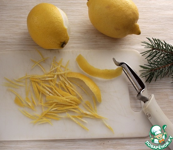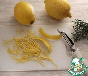Для новогоднего декора с 1-2х лимонов овощечисткой срезать цедру и нарезать тонкой соломкой
