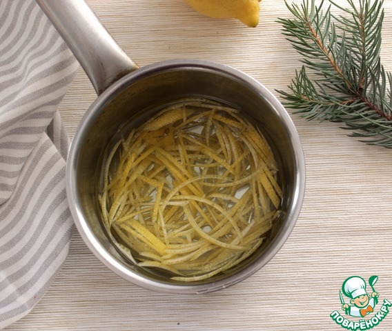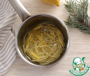Лимонную соломку залить холодной водой и поставить на огонь, довести до кипения, воду слить, заново налить холодной воды, опять довести до кипения и воду слить. Повторить 3-4 раза, чтобы ушла горечь.