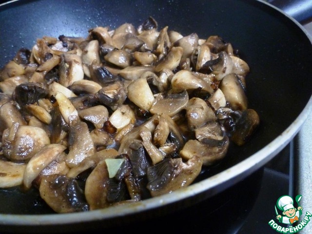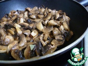 Шампиньоны нарезать тонкими пластинками и отправить на сухую сковороду. Выделится много сока, тушить пока сок не выпарится, затем влить масло и немного поджарить. Советую сильно не зажаривать, пусть грибы останутся сочными.