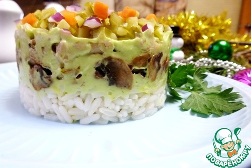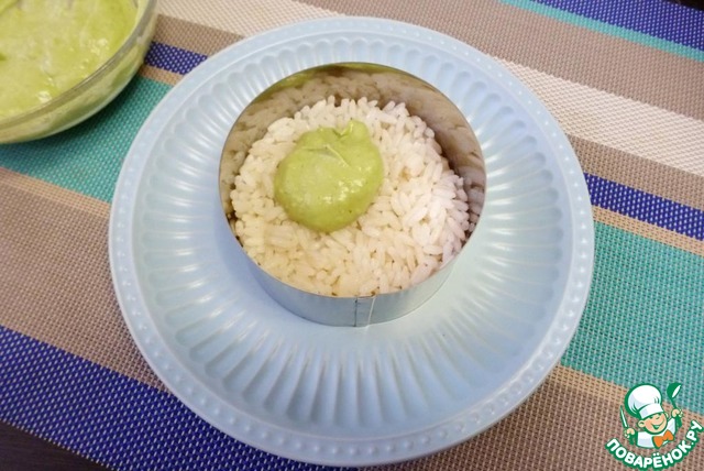 Салат собирается слоями. Первый слой варёный рис. Смазать этот слой приготовленной заправкой из авокадо с чесноком.