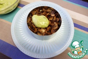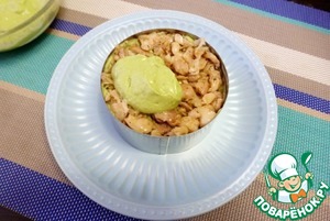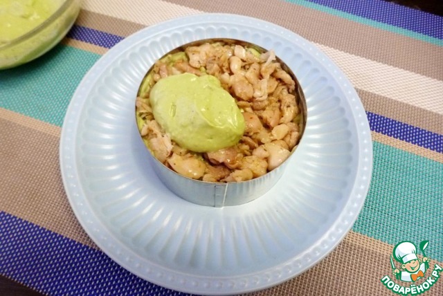 Третий слой - обжаренное куриное мясо и заправка из авокадо.