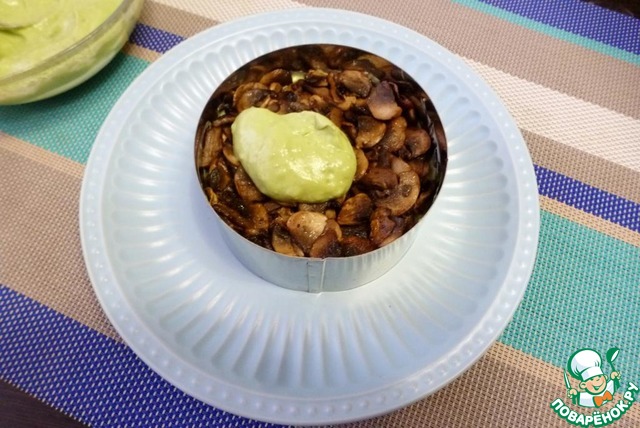 Второй слой - обжаренные шампиньоны, смазать слой заправкой.