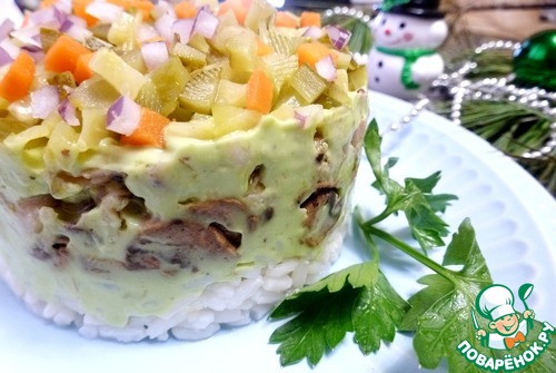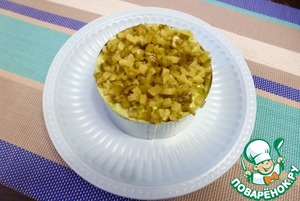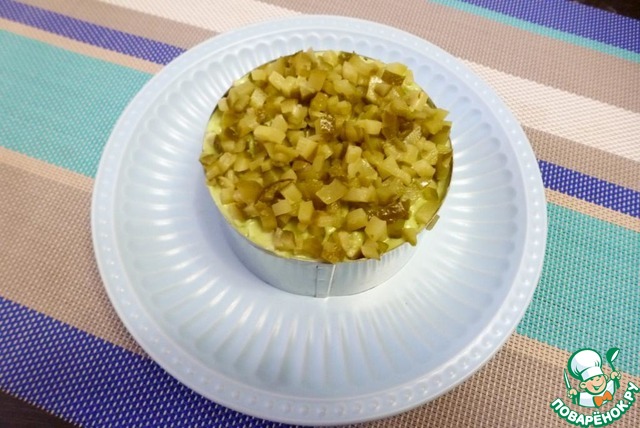Завершающий слой маринованные огурцы, нарезанные кубиком.