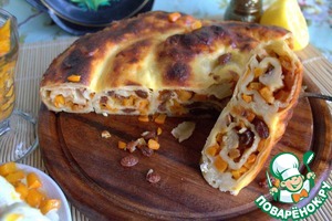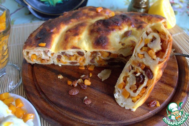 Классическая вертута с сезонной тыквой, но можно готовить с творожной и картофельной начинкой. Такое тесто называют ещё вытяжным, для раскатывания нужна большая поверхность. Познакомилась с ним у Ларисы (Украина), я немного внесла свои добавки в начинку.
