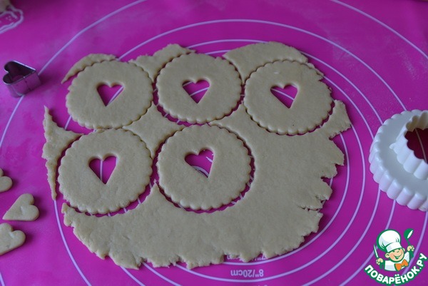 Мне показались дырочки большими и вторую партию делала дырочки в виде "сердечек". Вырезанное теста не раскатывала, а тоже выпекала. Так как при повторной раскатке тесто более тёплое, структура изменяется. Кладём заготовки печенья на застеленный пергаментом противень.