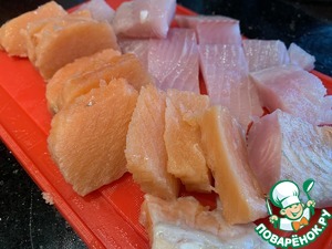 Филе рыбы нарежьте небольшими кусочками, если попадаются кости, аккуратно вытащите их пинцетом.
