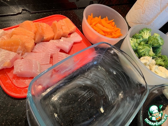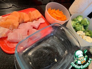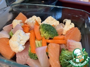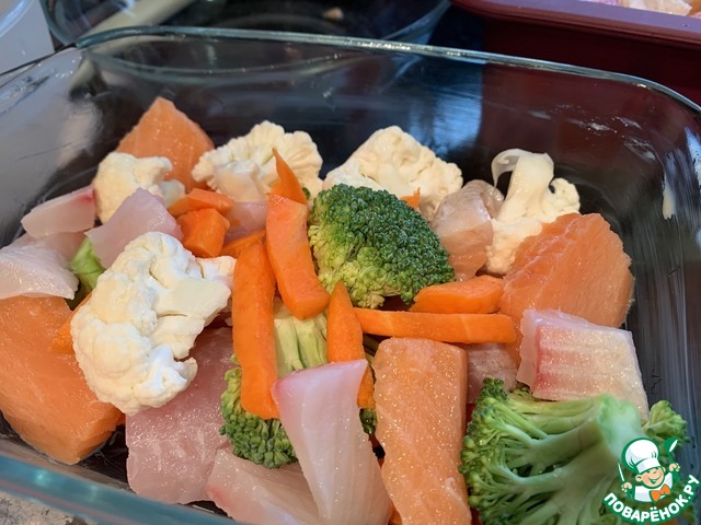 В форму для запекания, чередуя, выложите цветную капусту, брокколи, морковь и рыбу.