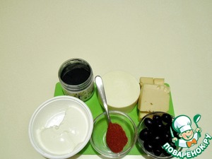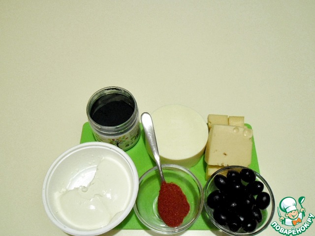 Для закуски приготовим несколько видов сыра. У меня моцарелла, мааздам и рикотта. Взяла, что было, можно и другой набор сделать. Маслины без косточек. Паприка молотая. Порошок спирулина - небольшая водоросль. Говорят, что ещё ацтеки собирали её с поверхности озер, сушили на солнце и использовали в пищу для оздоровления.