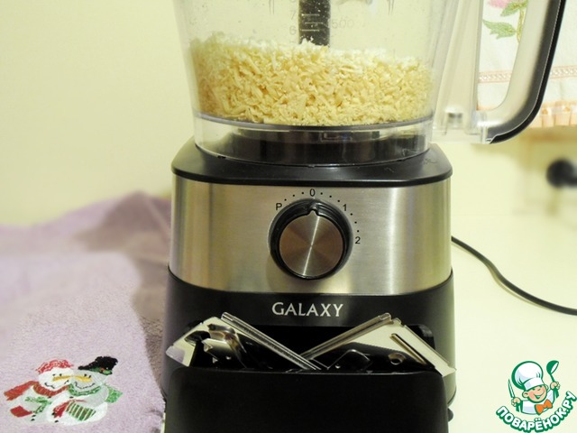 Сыр перетерла с помощью кухонного комбайна Galaxy GL2300, насадкой для шинковки. Добавила Рикотту, всё тщательно смешала (в этом шаге можно сыр присолить по вкусу)