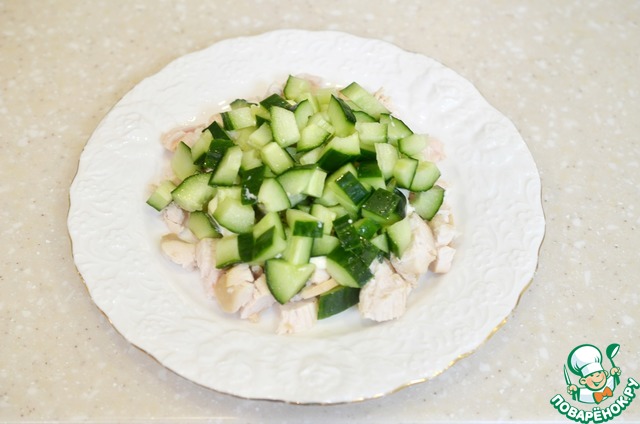 Курицу отварите, охладите, нарежьте небольшими кусочками.