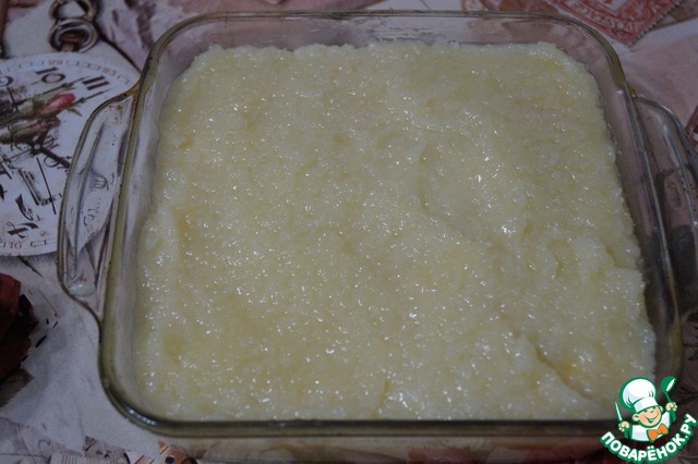 Готовую кокосовую массу вылить поверх манго и хорошо распределить по всей поверхности.