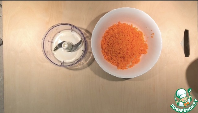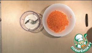 Так же измельчаем в блендере куриную грудку. У нас получится куриный фарш. Добавляем фарш к измельченным луку и морковке