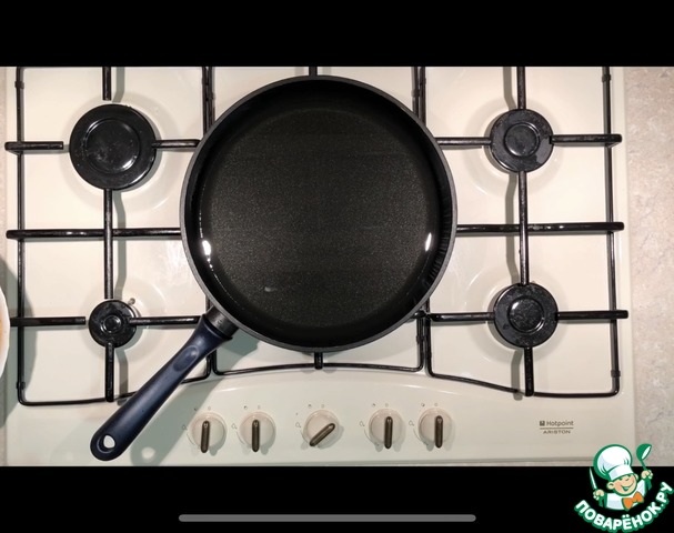 Ставим сковородку на плиту, наливаем туда масло для обжаривания и ждём пока оно разогреется. Важно что бы масло не перегрелось