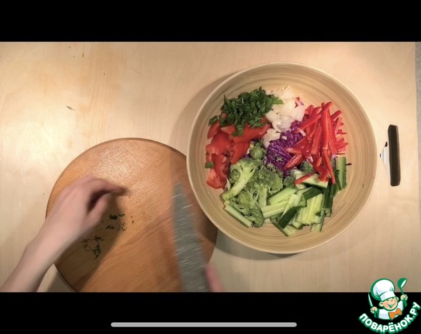 В миску для салата нарезаем основные ингредиенты (капуста, брокколи, паприка, огурец, помидор, лук, чеснок, укроп и петрушка)