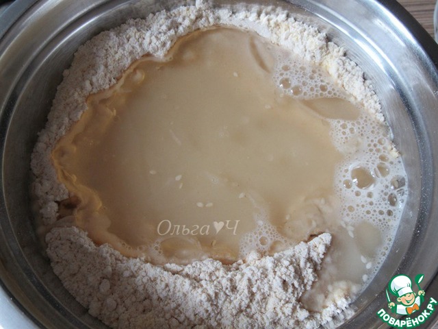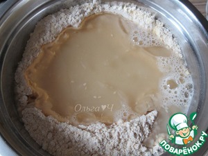 Воду с маслом довести почти до кипения, добавить к сухим ингредиентам.