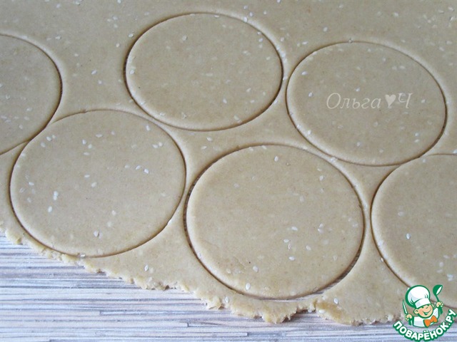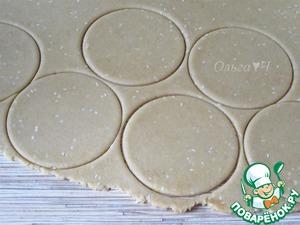 Тесто раскатать толщиной 2-3 мл, вырезать кружки диаметром 9-10 см.