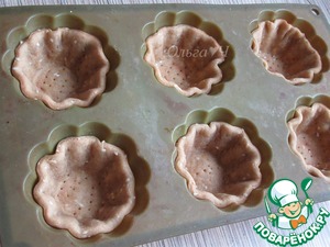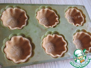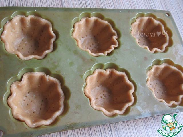 Поместить в формочки, потыкать вилкой, чтобы тесто не пузырилось при выпечке или запечь "вслепую", проложив пергамент и насыпав горох или фасоль (я так не делала).