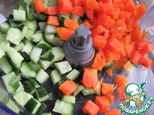 Огурец и морковь нарезать кубиками с помощью кухонного комбайна.
