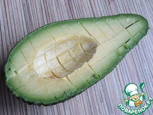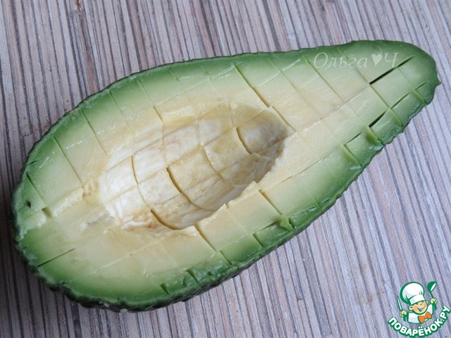 Авокадо нарезать кубиками прямо в кожуре, аккуратно вынуть мякоть столовой ложкой.
