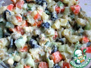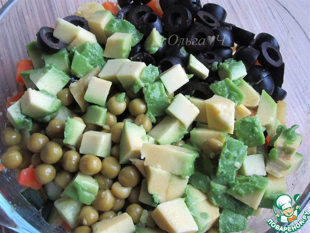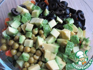 Выложить к овощам. Добавить нарезанные пополам маслины и зеленый горошек, перемешать.
