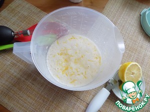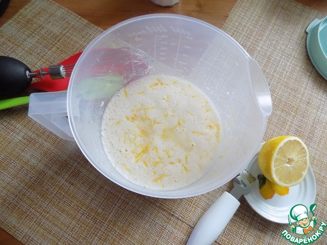 Далее наливаем масло подсолнечное и сметану. Опять взбиваем. Снимаем цедру с половинки лимона. Отжимаем 2 ст л лимонного сока. Соединяем.