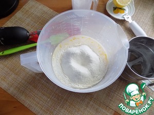 Муку смешиваем с разрыхлителем и просеиваем в смесь. Венчиком соединяем. Я разрыхлитель использую с шафраном. Он окрасит немного цвет теста в жёлтый цвет. Можно использовать любой.