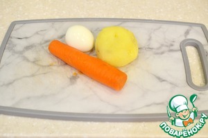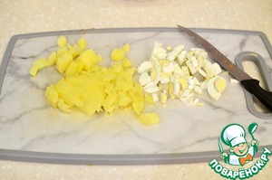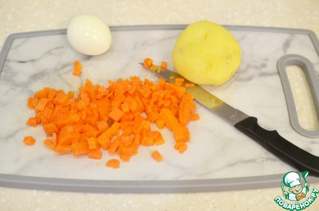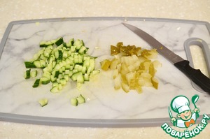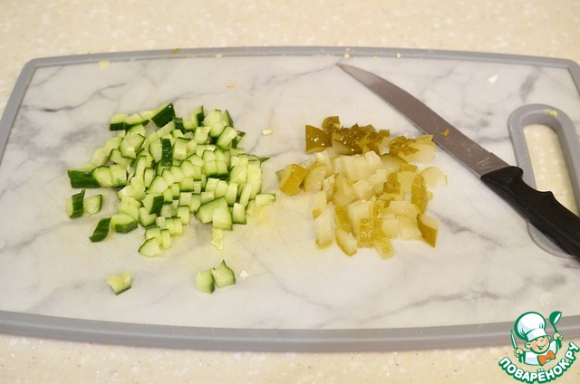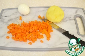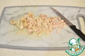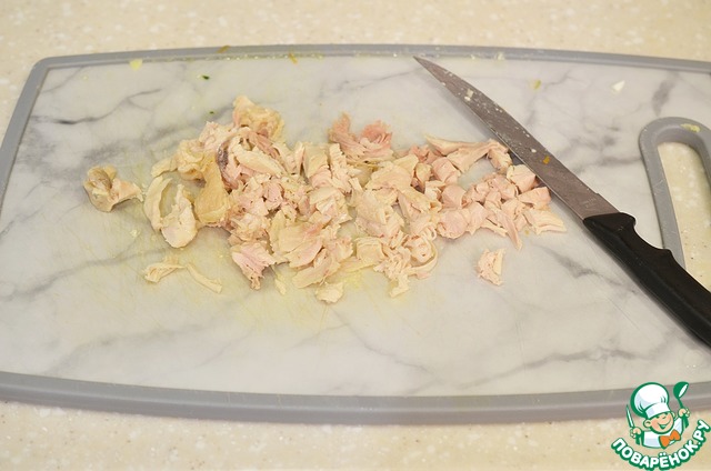Курицу отварите, охладите и мелко нарежьте. Немного бульона оставьте для нашего салата.