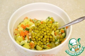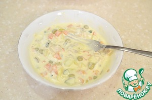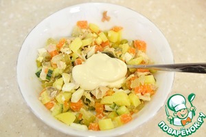 В салат добавьте курицу и оставшийся майонез, перемешайте.