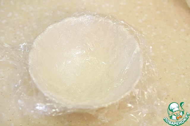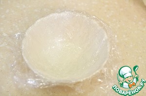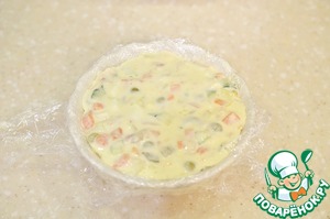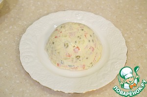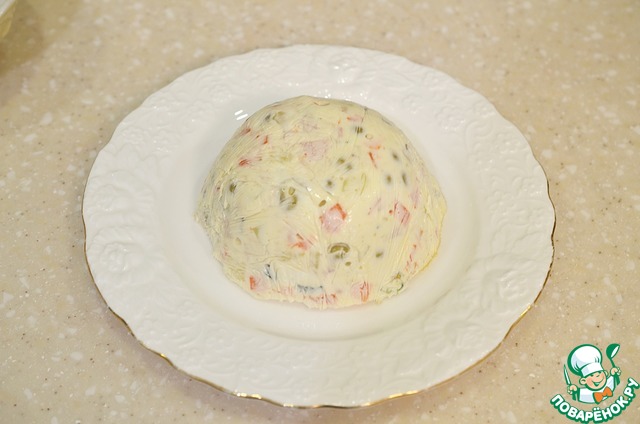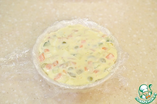 Выложите салат, заверните конце пленки наверх. Хорошо охладите около 6-7 часов.