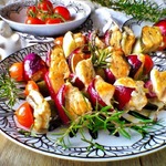 Закусочные мини-шашлычки всегда пользуются успехом за столом, это не только вкусно, но и красиво. Если составляющие шашлычка выбрать яркие и контрастные по цвету, то они сразу привлекут внимание ваших гостей. У меня красные помидоры, зеленые огурчики, фиолетовый лук. Вместо шпажки я использовала веточки розмарина, они не только ароматизируют рыбу и овощи, но и делают зауску оригинальной и красивой.
